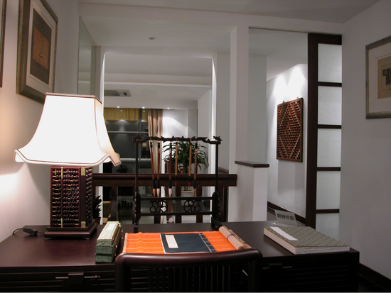 中式的空间描述,就像大家听说过的“亭台楼阁”。这是上海十几年前做的一个案例,利用两层的错层,客厅的部分是4.5米、4.5米往上叠。客厅旁边作为附属空间的部分,三米是正常的高度。错层和一般的高度变化时,就有比较小的、一米多高度的错落,所以这种小的错落里面就完成了类似这样的设计。这个案例有笔墨纸砚的元素,灯也是特别找来的。