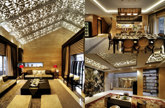 这个别墅里我们希望表现到花鸟鱼虫,还有屏风,然后是把挂的字放大了。所有的装修,硬装的元素基本不存在,所谓传统的中式的表现都在软装这里面完成了。