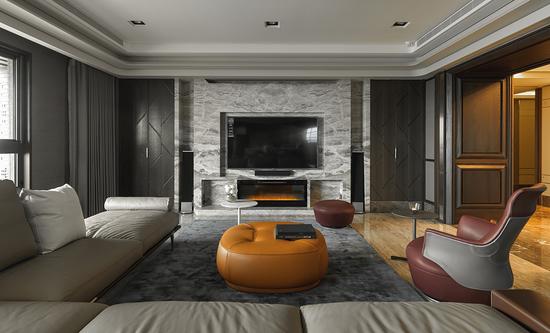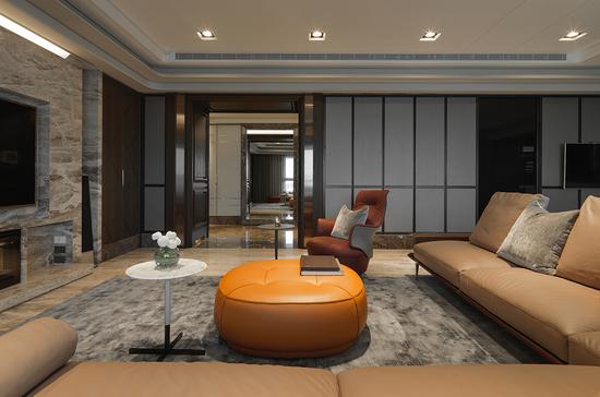 大理石材质的电视墙下,收纳和音响设备都给予足够的自由空间,为营造随性轻松的空间氛围,暖色沙发和单椅打破了沉寂呆板。背后的餐桌呈椭圆形状,舍弃规矩餐桌的方向性,用餐者可以任意角度入座。