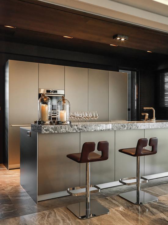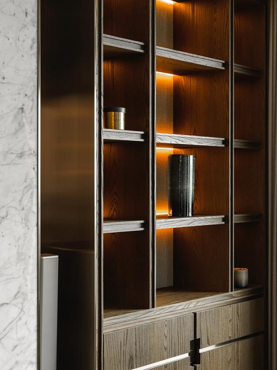 展示柜为空间中不可忽略的存在,业主的藏品之多使其呈现出艺廊的效果。用精准的灯光使视觉聚焦。无论是小到门把手一样的部件,还是低到视线最低点的踢脚线造型,整合了现代简约的设计手法,融合镀钛、金属等流行元素,在不经意间触动人心。