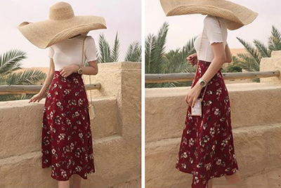 T恤+碎花裙 尽显女人味的穿搭,比较常规的白色纯色T恤,修身的版型非常贴身,凸显着傲人的胸围,搭配下装的碎花小红裙,随意间凸显迷人的身材曲线,超级好看,红色搭配白色的色调真的不挑人,闭眼穿上都能凸显气质,显瘦显高还显比例,造型满分,这个夏季就这么穿吧!