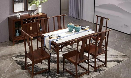 中国人讲究团团圆圆,家和万事兴。餐桌是血脉的延续也是礼仪的课堂。大体框架选用乌金实木,桌面别具用心选择大理石,古今相遇,即是长辈与晚辈的相处,如此融洽又各具特色。