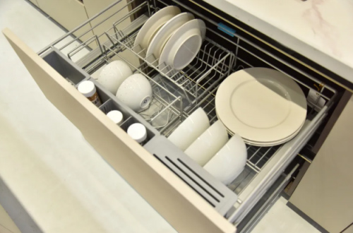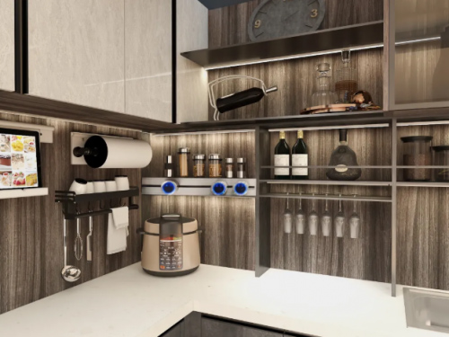 同时领尚橱柜可设置玻璃门式吊柜,放置不常用物品,密封保存,防止灰尘污染,哪天需要时就可一眼找到。此外,还设置多种收纳配件,碗碟拉篮、旋转拉篮等,灵活物品收纳,便捷物品拿放!领尚橱柜还充分利用墙面空间,墙上设计层板架,以便放置调味品、厨房纸、刮皮刀等小工具。