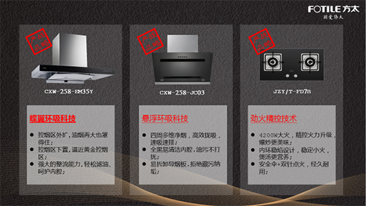 在家装节的最后,方太武汉培训部夏秀芳向与会人员展示了方太“黑科技”——分别运用了蝶翼环吸科技和悬浮环吸科技的两种不同型号的新款油烟机。蝶翼环吸科技,能够实现控烟区外扩,油烟再大也罩得住;控烟区下置,逼近黄金控烟区;强大的整流能力,轻松滤油、呵护内腔;而运用了悬浮环吸科技后,能够实现四周多维净烟,高效拢吸,速吸速排;全黑易清洁内腔,油污不打扰;易拆卸导烟板,拒绝藏污纳垢。还有运用了劲火精控技术的燃气灶,4200W大火,精控火力升级,爆炒更美味;内环稳焰设计,稳定小火,煲汤更营养;安全伞+双针点火,经久耐用。