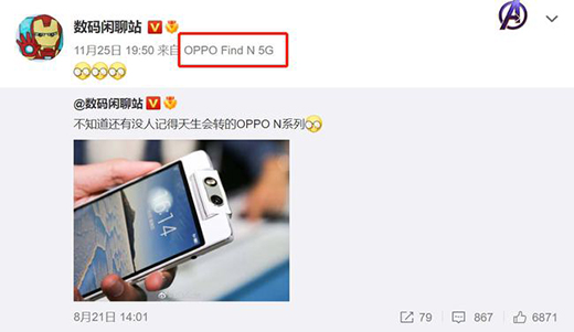 近日根据@数码闲聊站微博小尾巴显示,看来绿厂N系将会回归,新机将归属于Find系列之中,不知道会不会延续翻转镜头的设计。