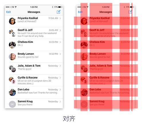 对齐除了能建立一种清晰精巧的外观,还能方便开发的实现。基于从左上至右下的阅读习惯,移动端界面中内容的排布通常使用左对齐和居中对齐,表单填写的输入项使用右对齐