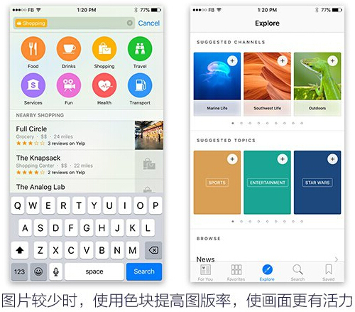 App的页面结构和文本确定之后,就要开始安排图标/按钮/图片的安排了,这时页面也就从单纯文本的“阅读”型结构调整为“观看”型结构,对于页面的易读性以及页面整体的效果会产生巨大的影响。页面中图片所占的比率叫做图版率,通常情况下降低图版率会给人一种宁静典雅、高级的感觉。提升图版率会有充满活力,使画面有富有感染力的效果。
