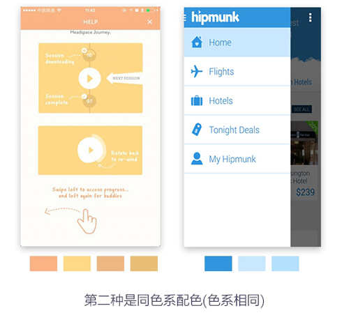第二种是同色系配色(色相一致,饱和度不同),主色和点晴色都在统一的色相上,给用户一种一致化的感受。