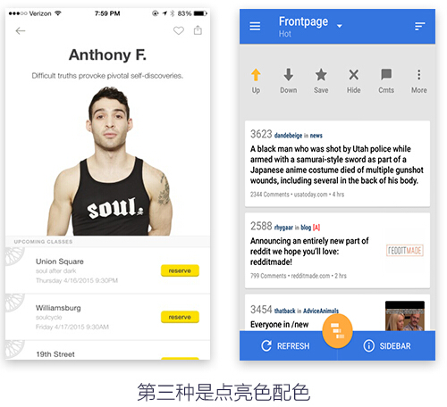 第三种是点亮色配色,主色用相对沉稳的颜色,点晴色采用一个高亮的颜色,起带动页面气氛,强调重点的作用。