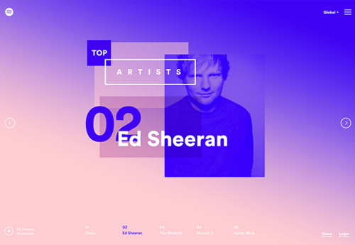 双色调配色已经存在很长的一段时间了,单我们几天所说的双色调方案是在全屏设计背景下,加入渐变效果和高冲击力视觉设计下的双色调配色方案。在扁平化的大势之下,Spotify 大范围使用双色调配色,将这一设计手法推到了潮头。