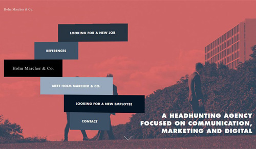 双色调颜色的选择并不会使文本变得十分明显,而是以一种更温和却足以为目标服务的形式表现出来。Holm Marcher & Co.公司做的这个珊瑚蓝双色很有趣,而且创造了文字高度可读的背景。另外,导航元素使用的蓝色色调使画面变得更有活力了。