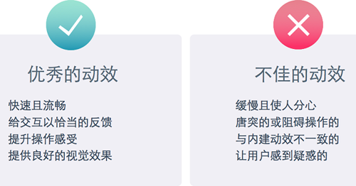 优秀的动效往往会被无视,而糟糕的动效却迫使用户去注意界面,而非内容本身。用户都是带着明确的目的来使用你的网站或者App的:买一件东西、学习新的知识、发现新音乐、或者仅仅是寻找最近的吃饭地点。他们不会只为了把玩你精心设计的界面而来,实际上,用户根本不在意界面设计而只关心能否在你这儿方便地达到他们的目的。优秀的动效应该对用户的点击或手势给予恰当的反馈,使用户能够非常方便地按照自己的意愿去掌控应用的行为,从而增强应用的使用体验。