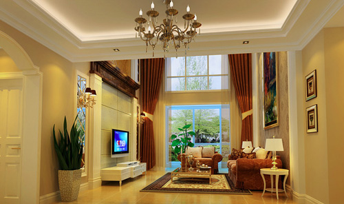 设计师采用现代温性的简欧风格,这样使整个空间现代而丰富。整体色调为米黄,重色彩出现在家具与配饰及木制造型上,使空间大方协调。该设计的精髓在于通过巧妙的造型,将吊顶和墙面装饰美感完美统一,特别是客厅的挑高部分的电视主体墙及造型吊顶,营造了华丽典雅的空间感……