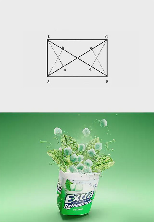 在以1:1.618比例构成的矩形ABCD上,画出对角线AC、DB,并过A、B、C、E4点作AC、EB的垂直线,得垂足a、b、c、d,此法可以简化寻找美感诱发点的方法(还是直接看图吧)。