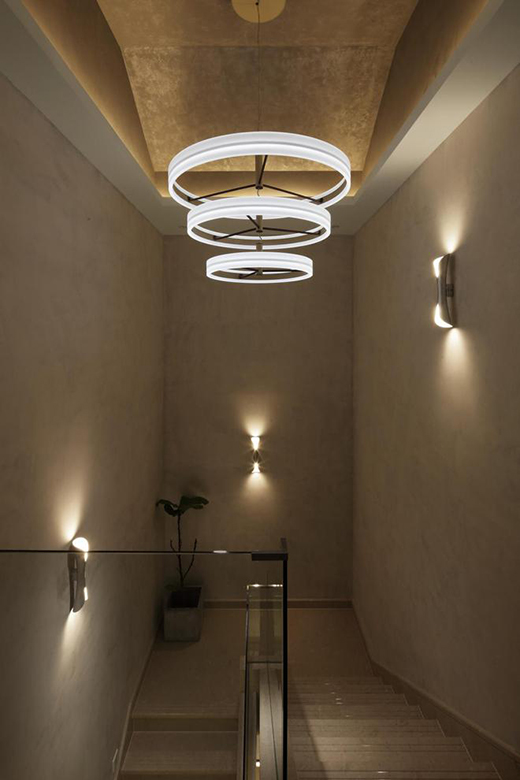 空间质感的塑造除了材料与色彩的搭配,灯光的配合往往更能够改变氛围感。设计师李中伟便选择在灯光设计上做点文章,“其实别墅最大的硬伤是层高,这个我们没办法改变,所以我考虑使用无主灯的方式,对于大平层和别墅而言,有些空间里,会选用见光不见灯的方式,而空间中灯光的塑造,还是需要考虑人的主体位置。”