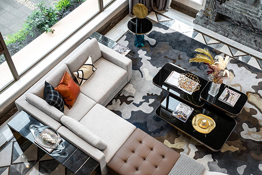 一层客厅空间,整体设计层次丰富且互相渗透,在多元材质、元素、文化符号的碰撞中,营造出独具一格的空间对话语言,时而诉说文化历史、时而演绎经典时尚、时而置换时空次序、时而营造艺术灵境,让我们在和谐整体的大氛围中,不断捕获折衷主义的新生魅力。