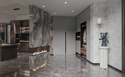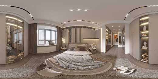 灯光不仅仅是起到照明的作用,在方案里舍弃了明装吊灯、灯带等,沿用无主灯、藏磁轨灯,将光源由普通的泛光改变成了有方向、有重点的光源。例如进门入户天花嵌入的走马灯,一直延续到走廊,是迎接工作回来家人的第一束光,就好像在光遇这款游戏开始时,人物也从一点星光开始,往后延续。