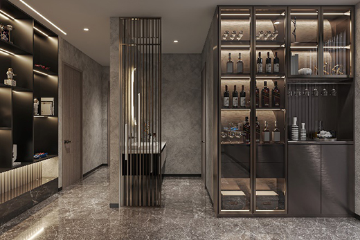 电视墙下方,暗藏的灯带一直延续到过道的展示柜下方,一是为了起到氛围灯光的作用,二通过灯光做一个引导,就像游戏中通过星光来表示宝藏,因为过道的展示柜,摆放的不是普通的工艺品,而是用来收藏展示,通过下方光源的表达,引导目光,并强调了设计中的想要表达的重点。