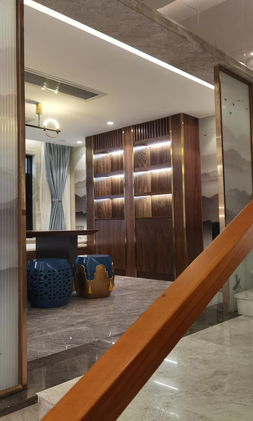 茶可静心,酒可消愁。酒窖是别墅设计工程中的明珠,不仅是因为对搭配的考究,更是要考虑到酒窖位置、温度湿度、灯光、酒架及其配饰等元素,才能既保证整体设计方案与新中式相融合,又保证了贮藏环境符合标准,因此是非常考验设计师的设计功力和知识水平。设计师采用了橡木色的木质酒柜,同时搭配金色金属边框,在传统的中式酒架中增加了现代轻奢的元素,整体视觉效果更显高档。
