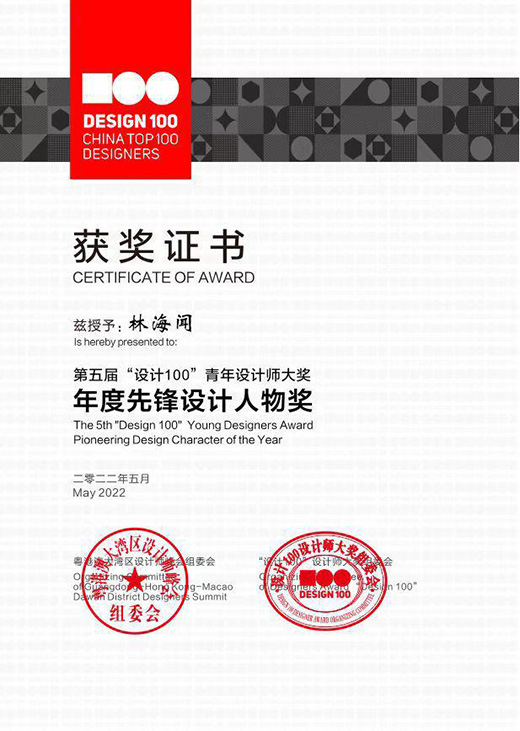 在“设计之都”这个舞台上,著名设计师、深圳市禾田设计工程有限公司(禾田营造)创始人林海闻凭借多年设计经验及高水平领导能力,荣获““设计100·年度先锋人物”称号。