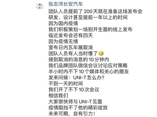 车展会取消,但豪车不会缺席。短短的几天时间,一场工作量不亚于线下的发布会活动——长安汽车UNI-T全球亮相线上直播发布会在3月5号(惊蛰)如期举行。正如宣传中所说,疫情无情,但阻拦不了UNI-T的精彩绽放,这也是所有长安人的斗志以及激情的绽放。