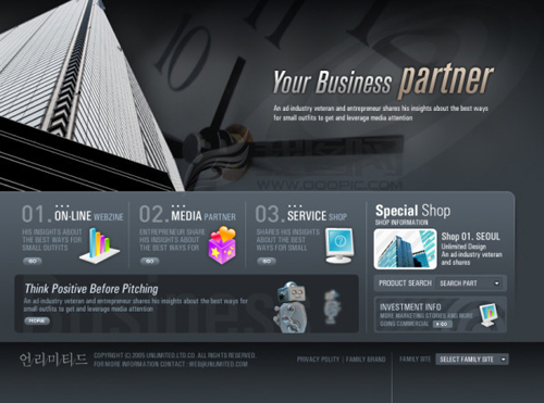 使用半透明元素来设计网页很美观也很需要技巧,半透明效果是指色块、文字或图片被“稀释”或者冲淡,使得颜色减淡,并且透出后方内容,执行到位的话,这种效果会非常震撼,能划出一块绝佳的文字展示区域,或者作为吸引注意力至图像某部分的手段,但是使用半透明时,设计师必须小心谨慎,这种效果很难处理得当,因为事关可读性,透明度使用错误的半透明块和文字也会能散注意力,并且破坏整体设计效果。