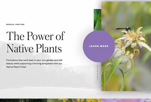 Mt. Cuba Center:植物识别网站使用悬停Buttons设计,图形和颜色几乎跳出屏幕。配合有趣迷人的Buttons交互动效,你能不点击吗?(几乎所有的图像是一个链接)Buttons在设计中采用大圆形、紫色、扁平化设计,如下图所示。什么是特别好的圆形Buttons,一眼看上去就知道它是一个Buttons。因为它是如此之大,你会猜测是否是Buttons,但悬停状态的显示方式让用户想跟它互动的冲动。这是出发用户互动的乐趣。
