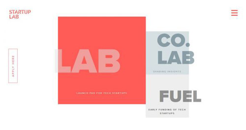 上方 Startup Lab 的网站就将色块和文本以极其时尚的方式搭配起来,文字横跨白色的背景和不同的色块,合理的色彩对比让整个视觉显得微妙又舒服。