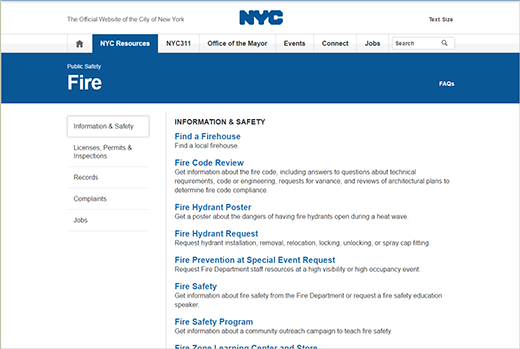 纽约市政府综合网站:让用户感到沮丧的是当点击寻找消防站(Find a Firehouse)链接时,只能在下一个页面中再点击一次拼写都不一样的链接。